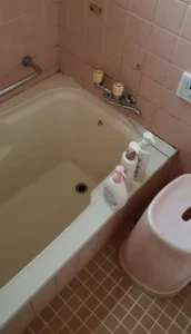 ただ、タイルの目地には黒ずみが見られ、浴槽まわりも経年による劣化が進んでいる状態でした。
